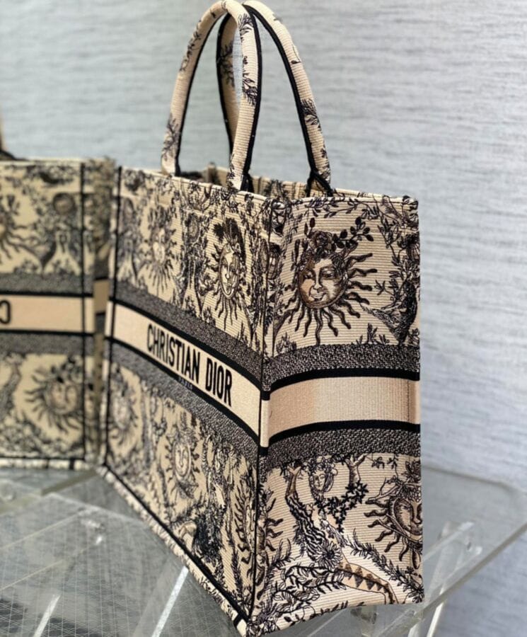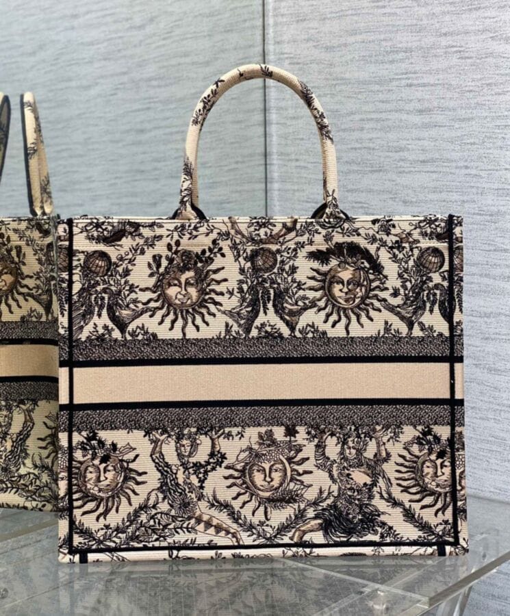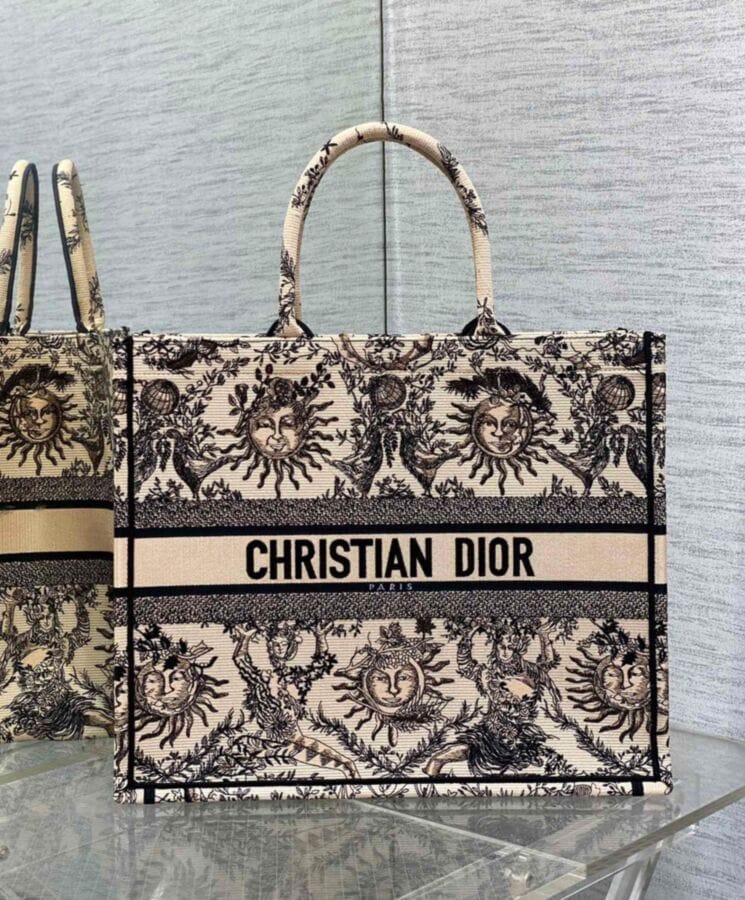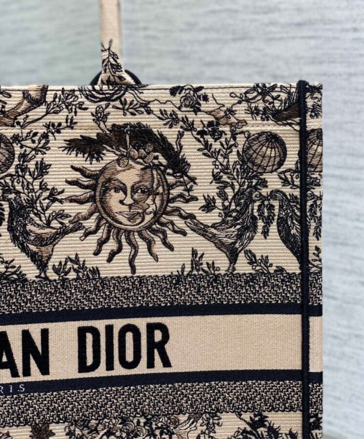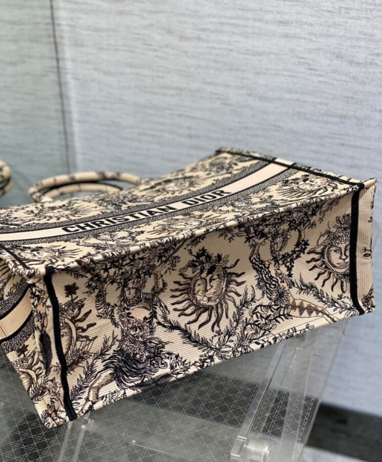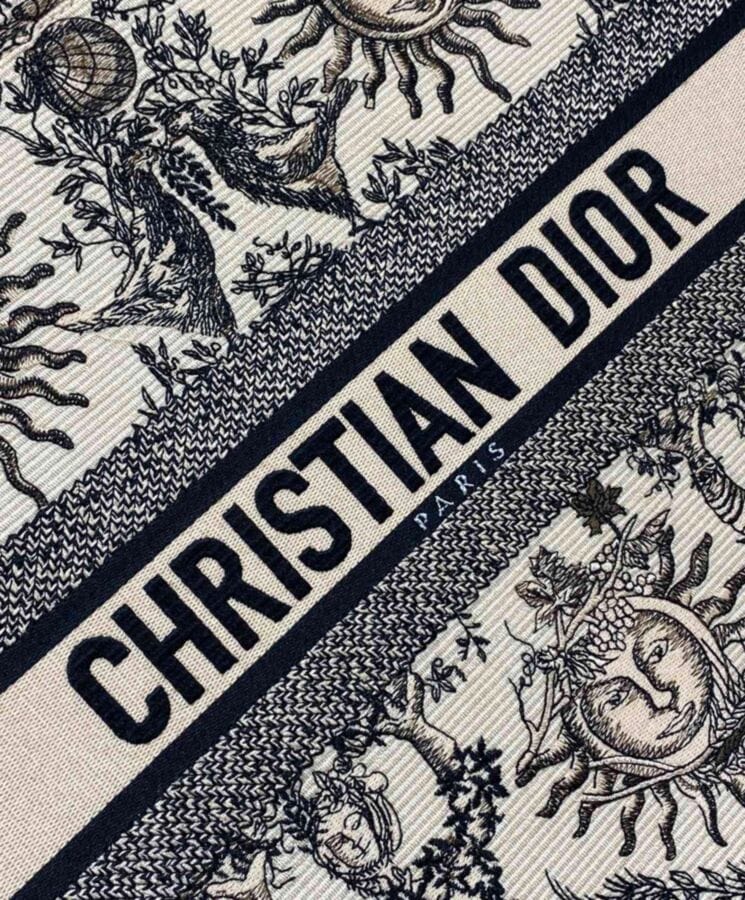 Designed by Maria Grazia Chiuri, Diorโs Creative Director, the Dior Book Tote is a timeless icon of the Houseโs aesthetic. Thoughtfully crafted to accommodate daily essentials, this large tote is fully embroidered with the seasonโs signature Toile de Jouy Soleil motif in beige and black. A reimagining of Diorโs classic pattern, it features intricate suns and crescent moons interwoven with florals, symbolizing the beauty of the four seasons. Showcasing the Houseโs exquisite craftsmanship, the design is finished with the Dior Paris signature on the front and can be carried by hand or worn over the shoulder.