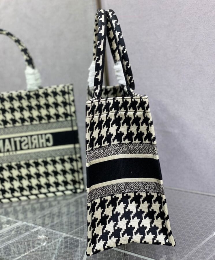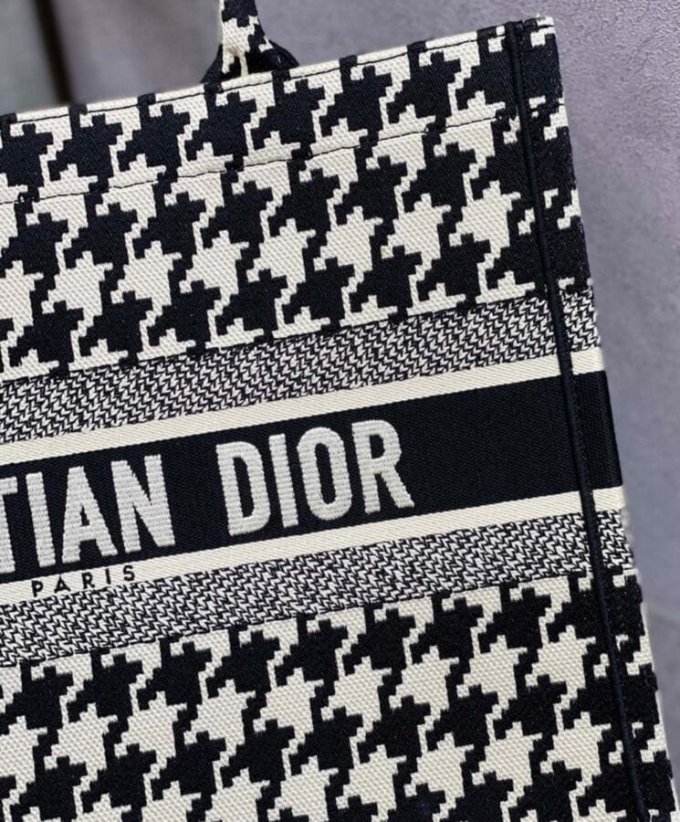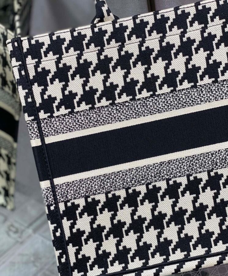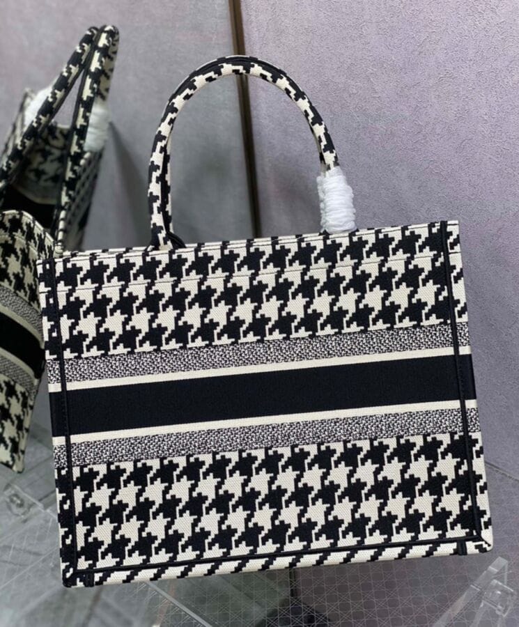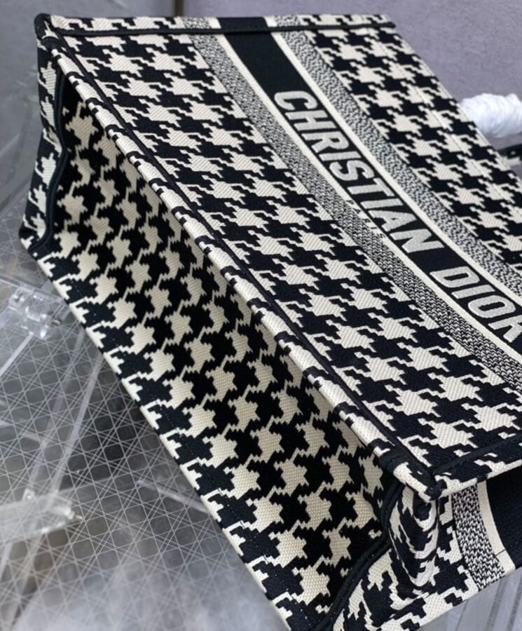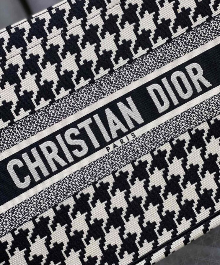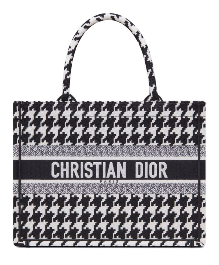 Designed by Maria Grazia Chiuri, Creative Director of Dior, the Dior Book Tote has become a cornerstone of the Houseโs aesthetic. Perfectly sized to hold daily essentials, this medium tote is fully embroidered with a macro Houndstooth motif, offering a modern reinterpretation of the iconic pattern while honoring Diorโs timeless codes. Showcasing the Houseโs exceptional craftsmanship, it is adorned with the โDior PARISโ signature on the front and can be carried by hand or worn over the shoulder.