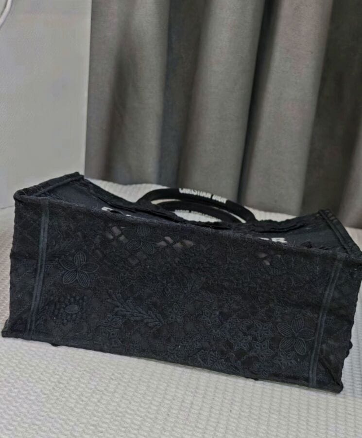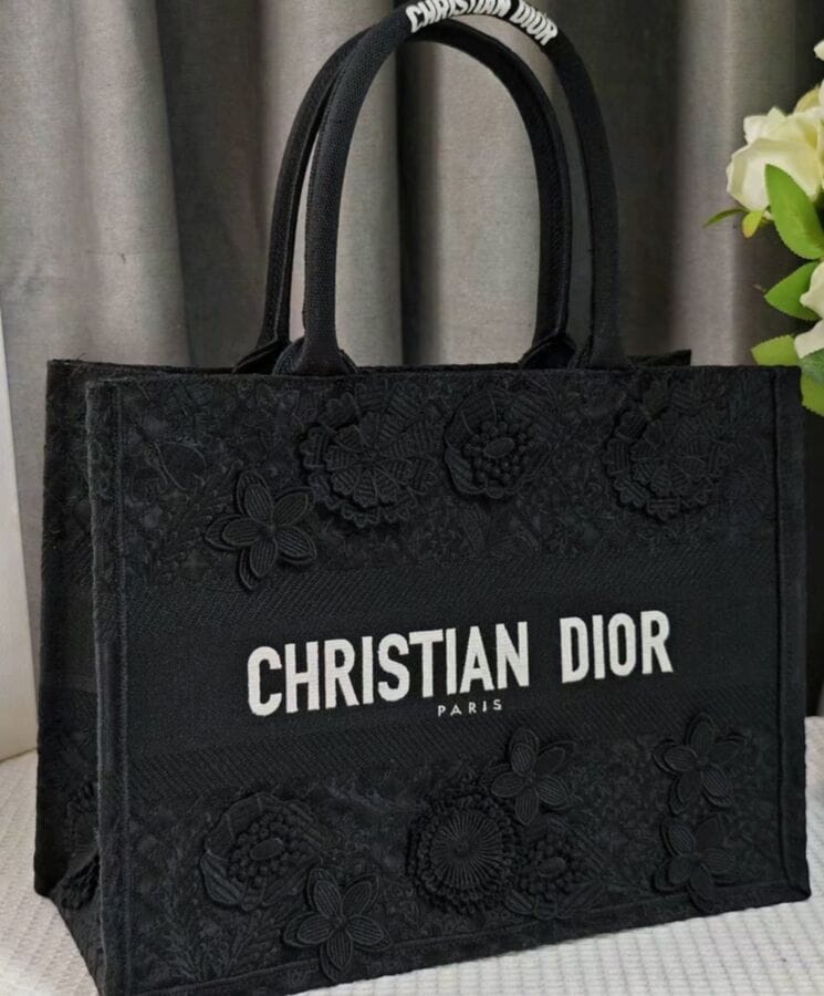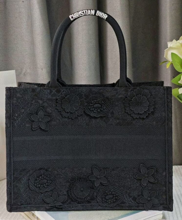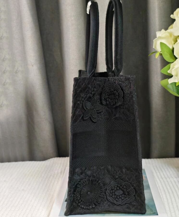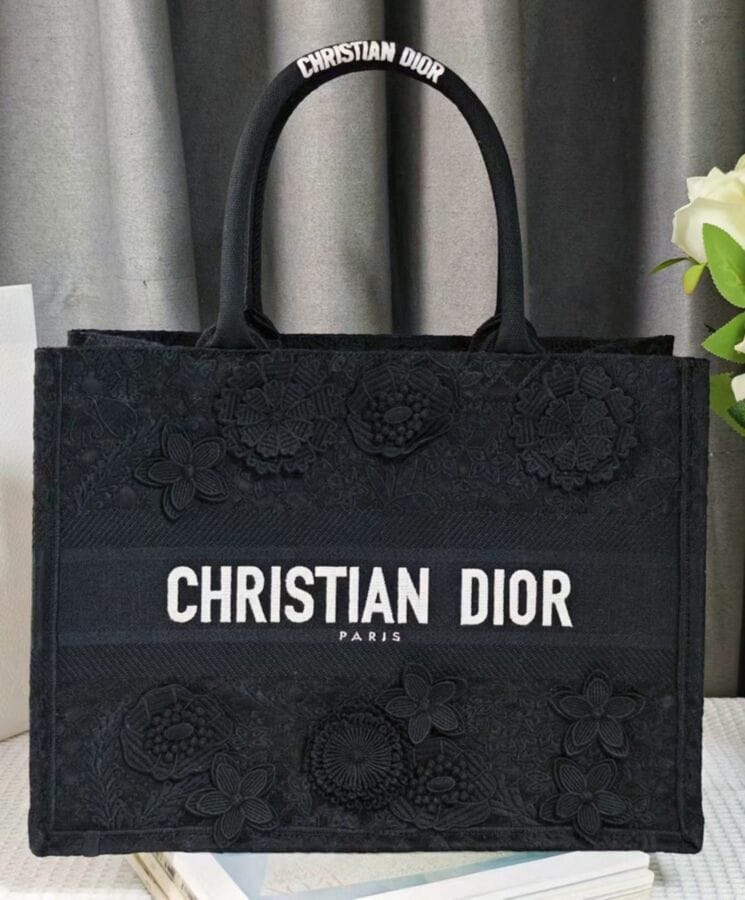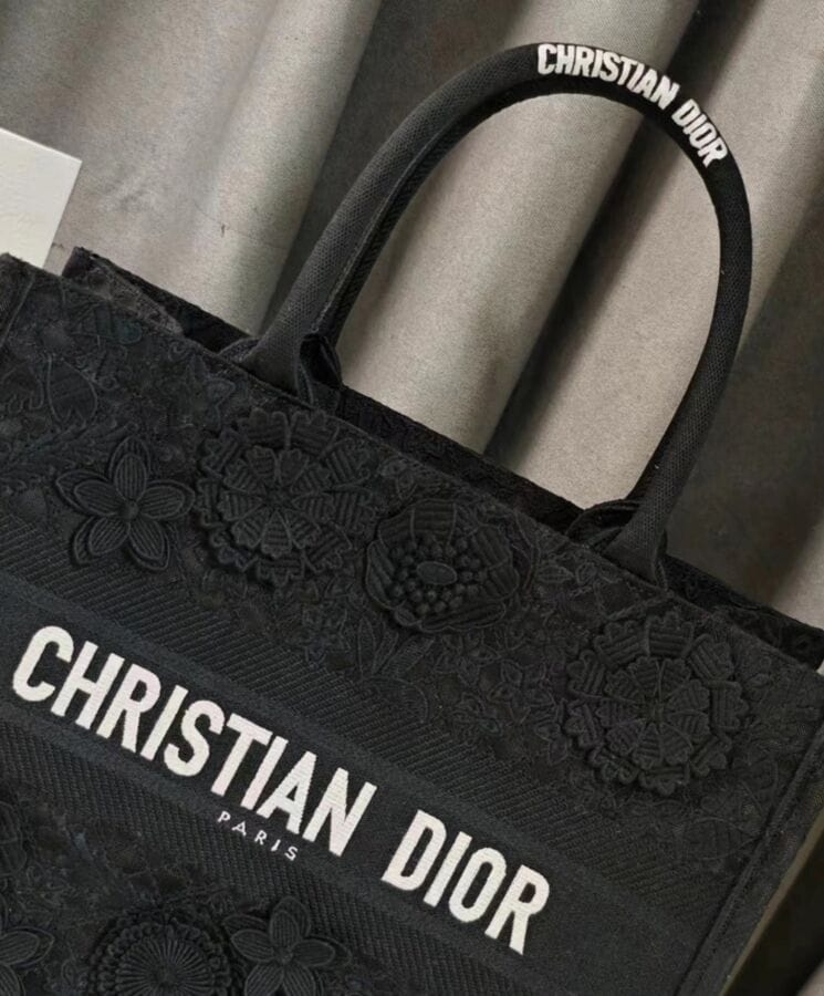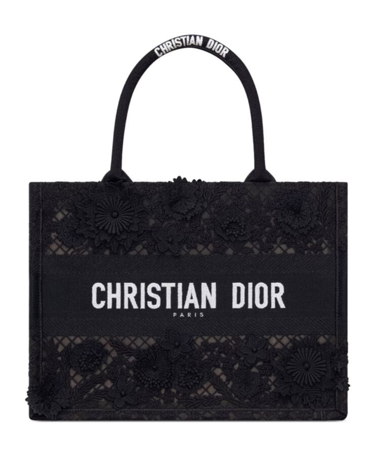 Designed by Maria Grazia Chiuri, Creative Director of Dior, the Dior Book Tote has become an essential element of the Houseโs aesthetic. Crafted to accommodate daily essentials, this medium-sized tote is fully embroidered with the intricate D-Lace motif, featuring a 3D Macramรฉ effect inspired by delicate lacework. Showcasing Diorโs exceptional savoir-faire, the design is further enhanced with hand-applied three-dimensional flowers. Adorned with the Dior Paris signature on the front, this elegant tote can be carried by hand or worn over the shoulder.
