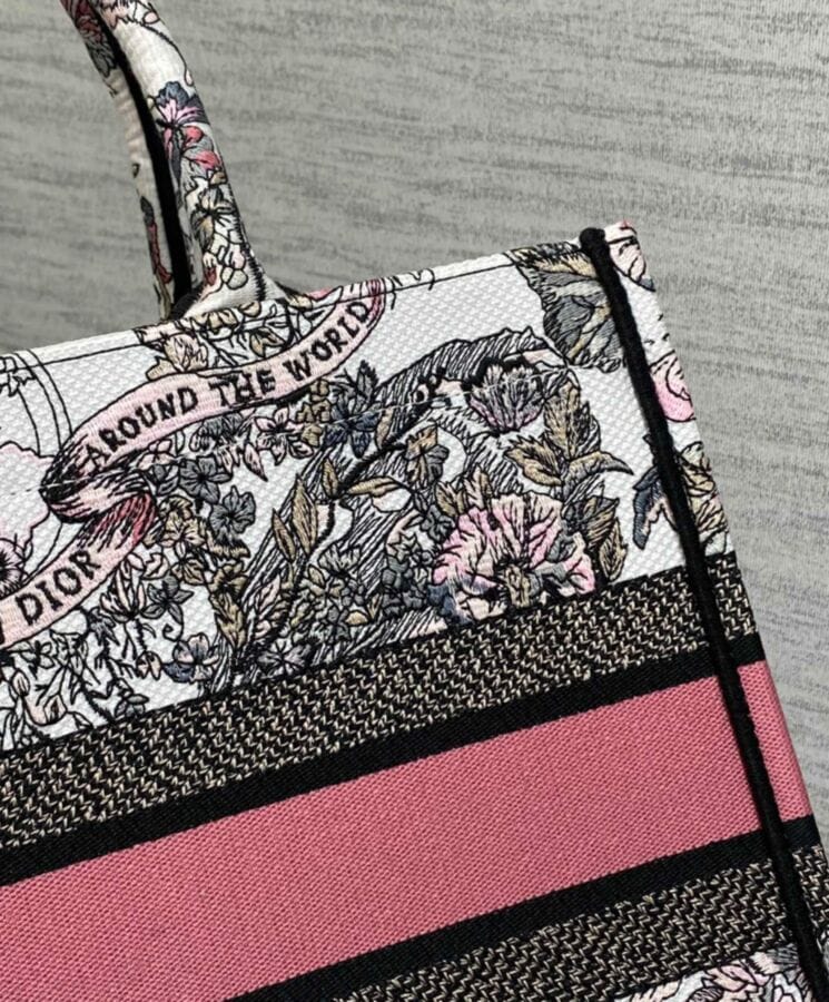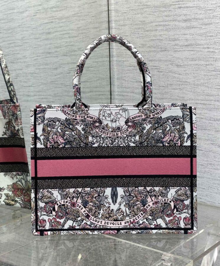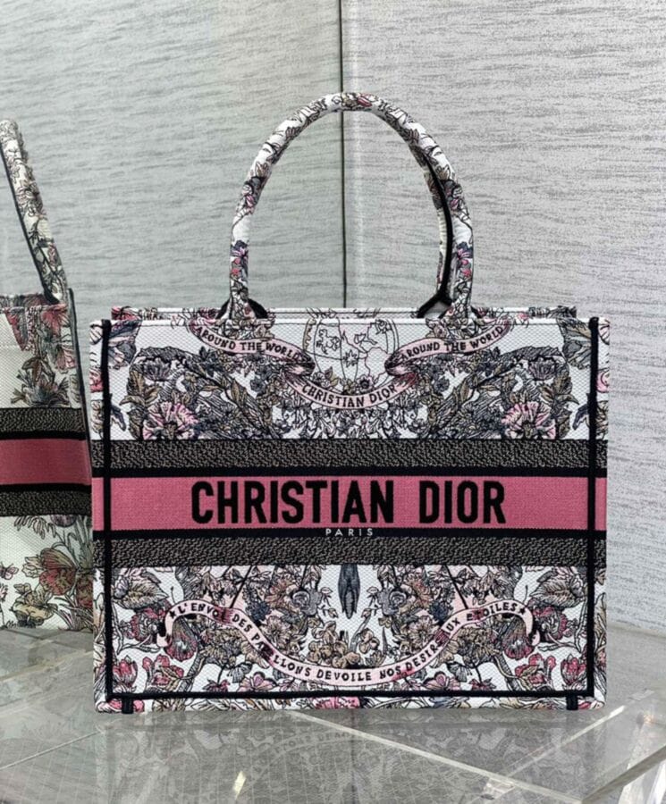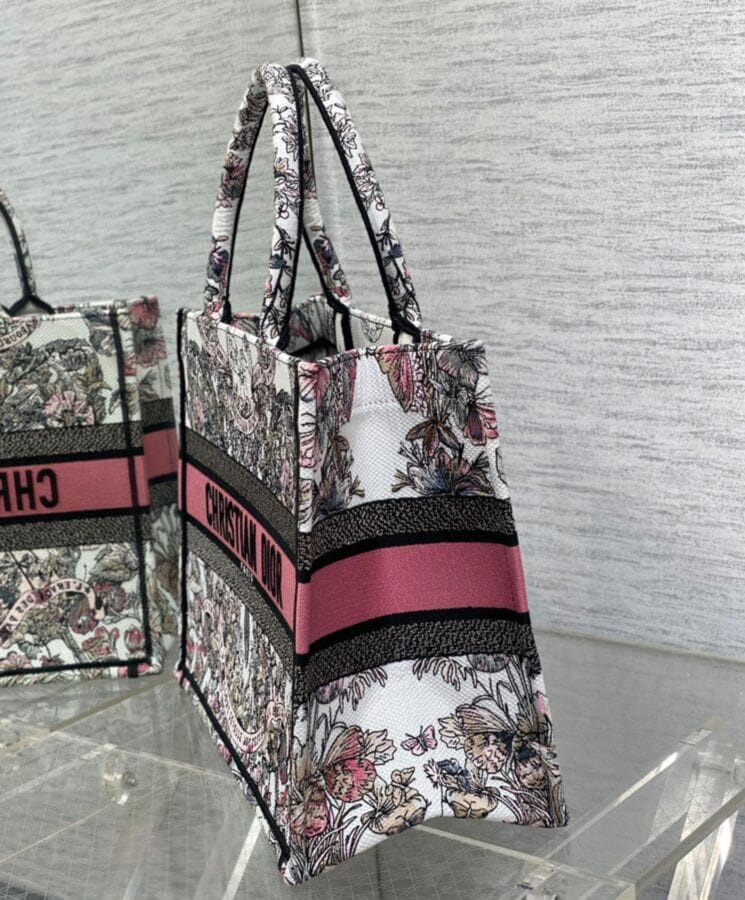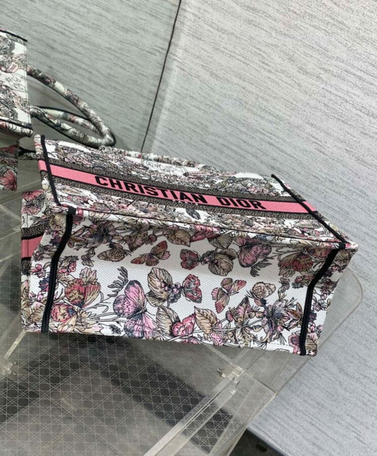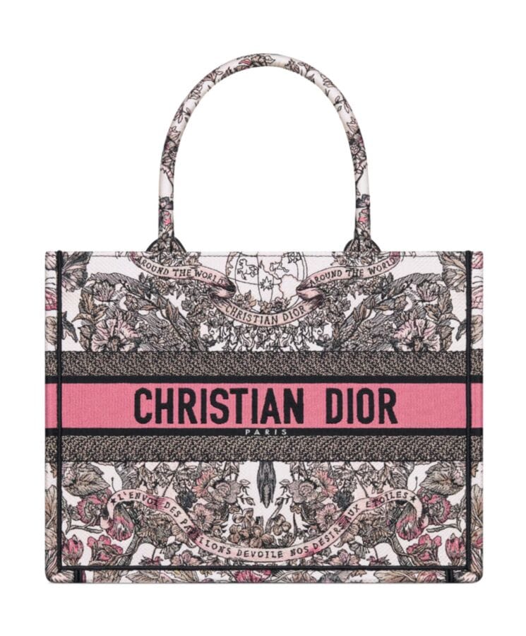The Dior Book Tote, designed by Maria Grazia Chiuri, Creative Director of Dior, has become a quintessential expression of the Houseโs elegant aesthetic. Crafted to accommodate daily essentials with ease, this medium-sized tote is adorned with white and pastel pink Butterfly Around The World embroidery, featuring the collectionโs signature butterfly motif alongside the poetic inscription: Lโenvol des papillons dรฉvoile nos dรฉsirs aux รฉtoiles. A testament to Diorโs exceptional craftsmanship, the design is beautifully finished with the “Dior Paris” signature on the front. Versatile and refined, it can be carried by hand or worn over the shoulder for effortless sophistication.