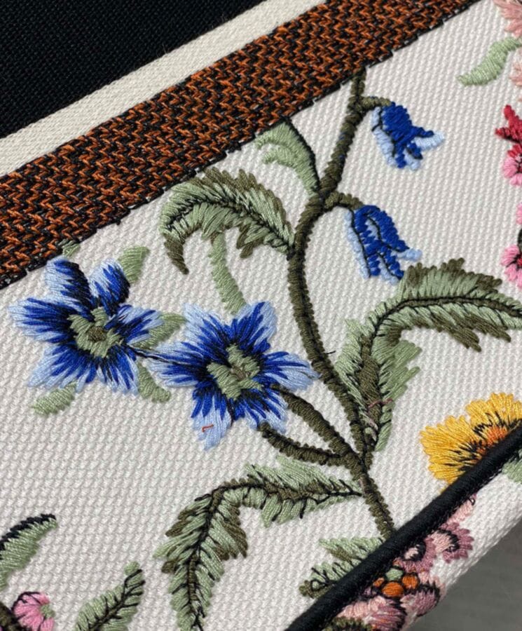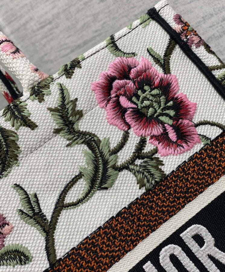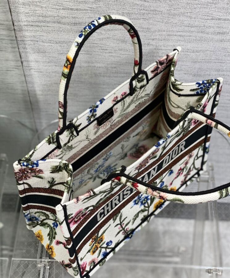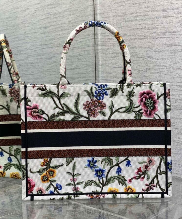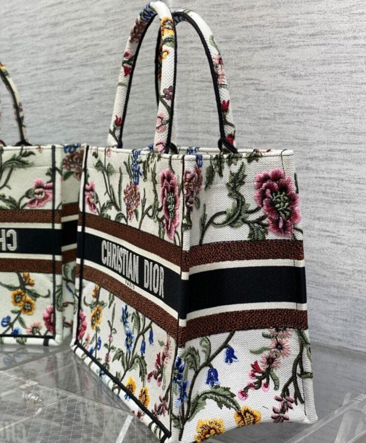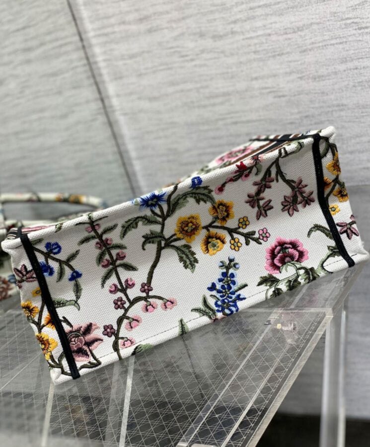 Designed by Maria Grazia Chiuri, Creative Director of Dior, the Dior Book Tote has become an iconic symbol of the Houseโs timeless aesthetic. Crafted to effortlessly hold daily essentials, this medium-sized tote is fully embroidered with the multicolor Dior Petites Fleurs motif, a romantic and vibrant tribute to Monsieur Diorโs enduring love for florals. A showcase of the Houseโs exceptional craftsmanship, it is elegantly finished with the “Dior Paris” signature on the front. Versatile and refined, it can be carried by hand or worn over the shoulder for effortless sophistication.