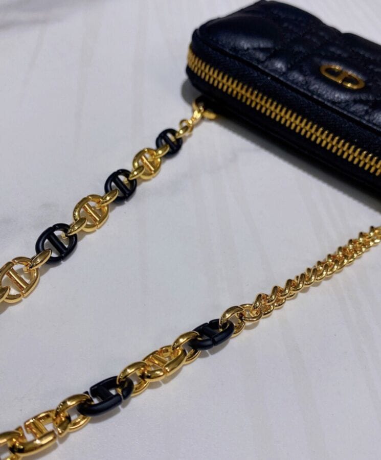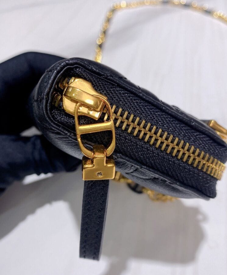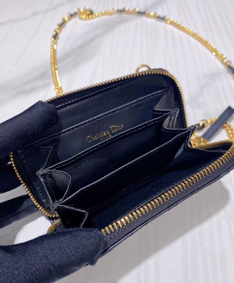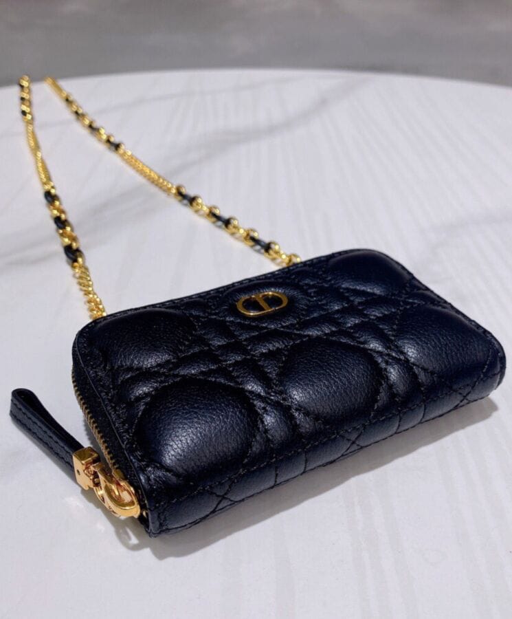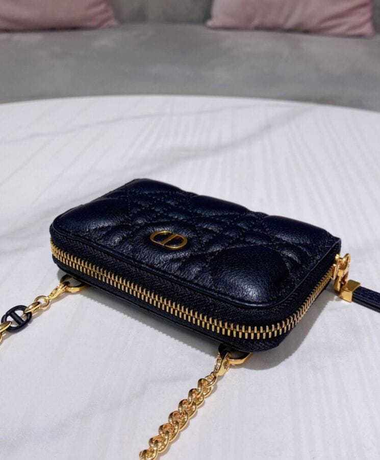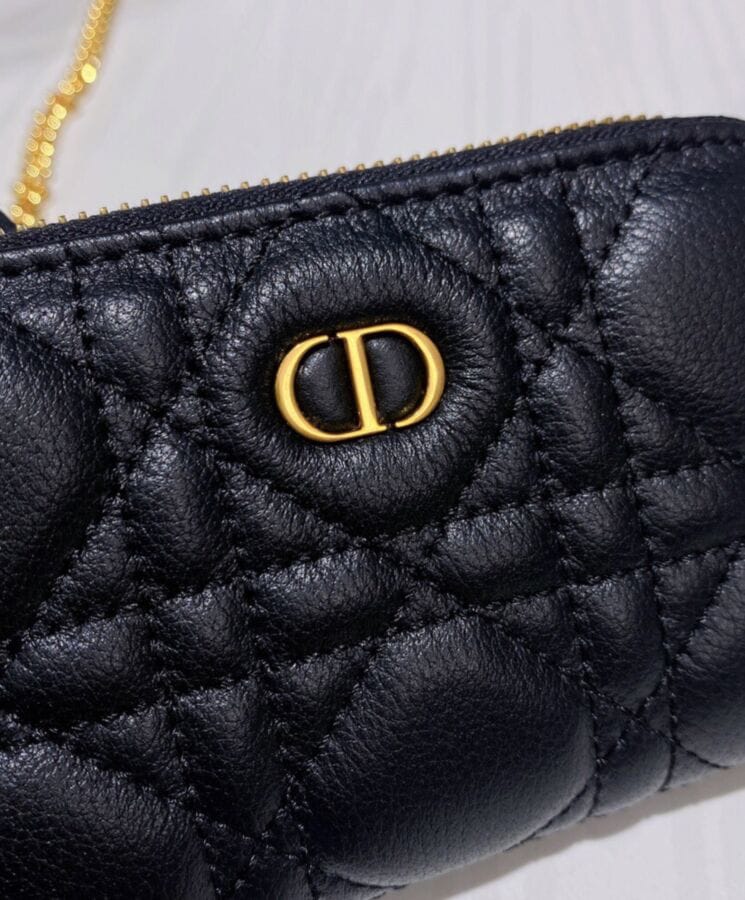 The Dior Caro zipped pouch is a sophisticated yet functional accessory, designed for effortless elegance. Crafted from supple lambskin and adorned with the Maisonโs signature Cannage topstitching, this compact piece embodies timeless refinement. Featuring a removable chain strap with enamel links, it offers versatile stylingโworn over the shoulder, crossbody, or tucked inside a larger bag for added convenience.
