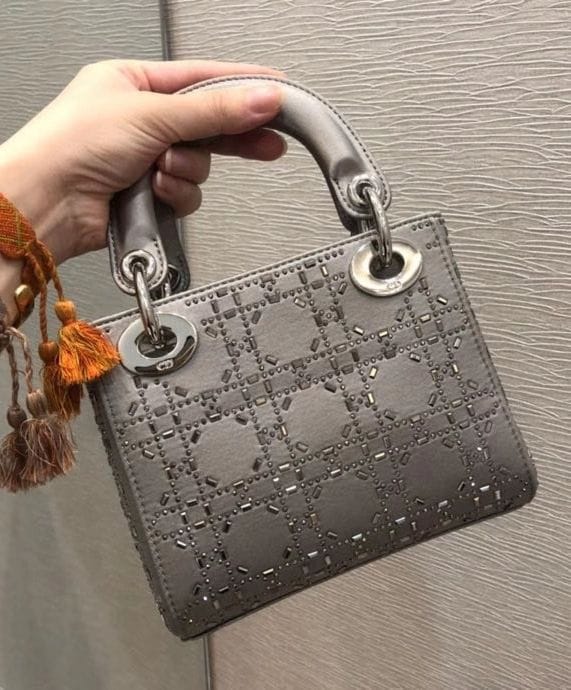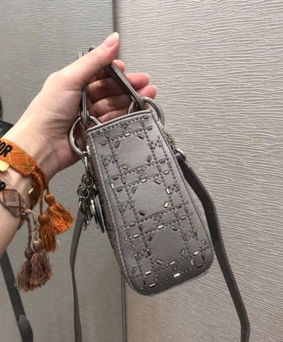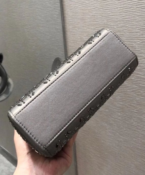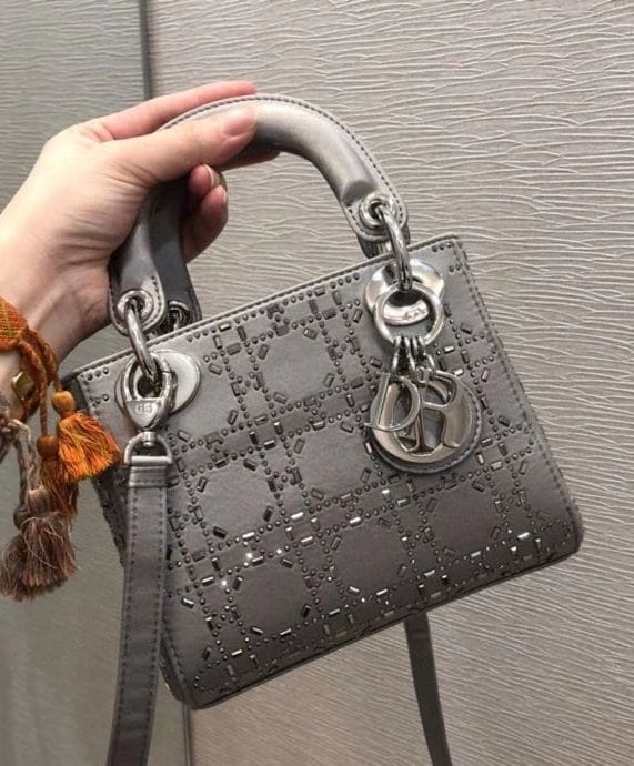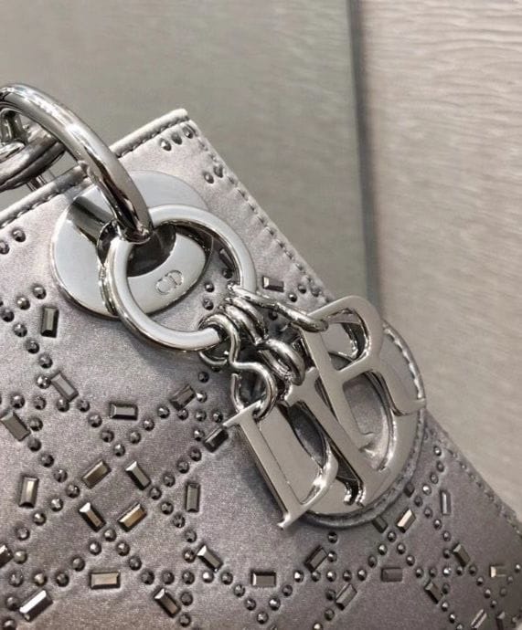 The Lady Dior handbag embodies Diorโs timeless elegance and modern sophistication. Crafted from luxurious satin, it is adorned with shimmering strass embroidery, offering a refined allure perfect for evening occasions. The silhouette is further elevated by palladium-finish metal D.I.O.R. charms, adding a luminous touch. Designed for versatility, the mini style features a thin, adjustable, and removable shoulder strap, allowing it to be carried by hand, worn over the shoulder, or styled crossbody.