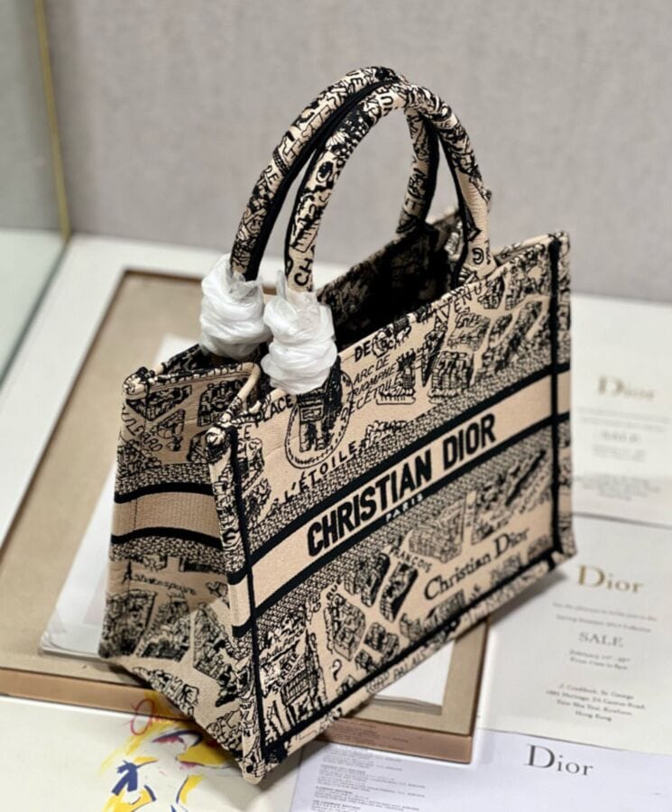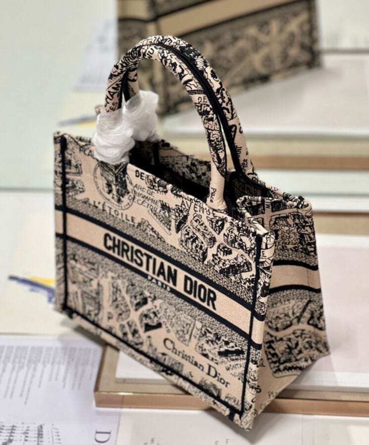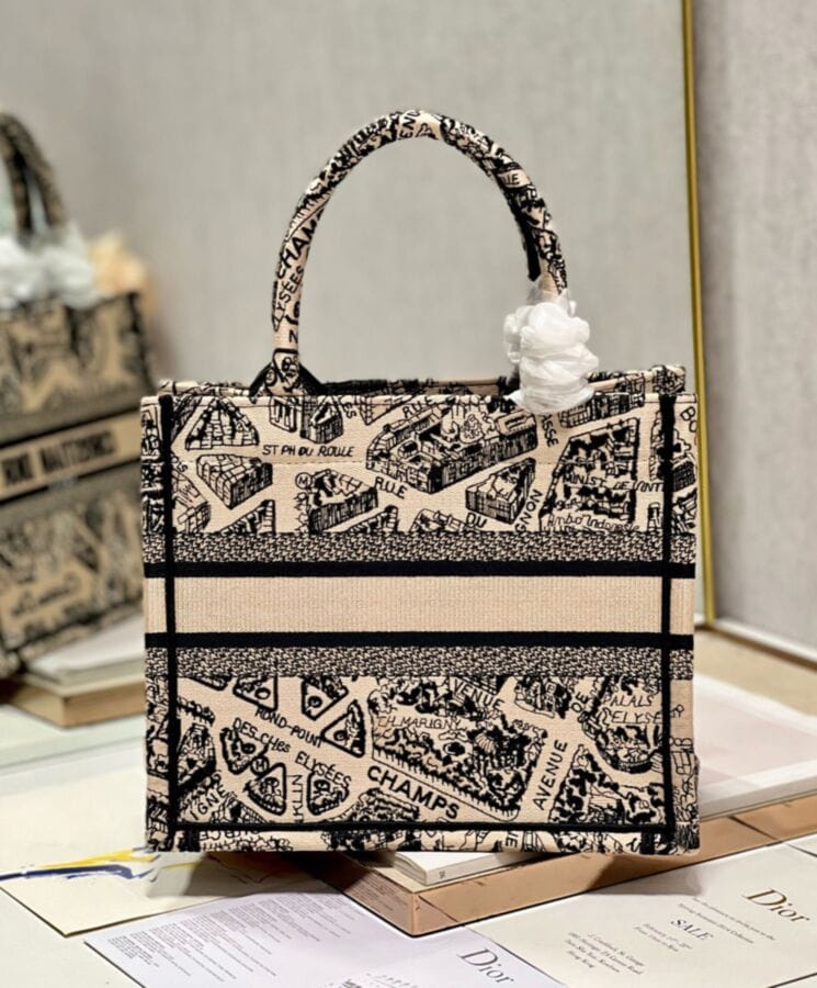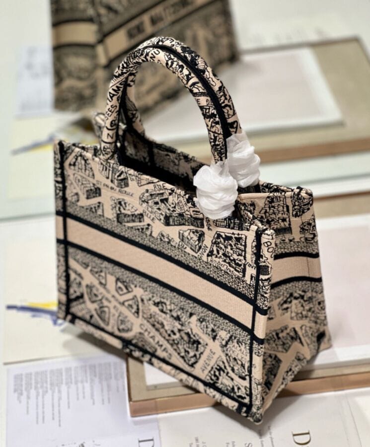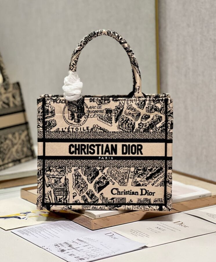 Created by Maria Grazia Chiuri, Creative Director of Dior Womenswear, the Book Tote bag has become an icon of the Dior aesthetic. This small version is beautifully embroidered with the Plan de Paris motif, a design inspired by the Dior archives that pays homage to the Houseโ€™s historic Avenue Montaigne address. Thoughtfully crafted to hold all daily essentials with ease and elegance, it showcases Diorโ€™s exceptional savoir-faire. Finished with the โ€˜Dior Parisโ€™ signature on the front, the bag can be carried by hand for a timelessly chic look.