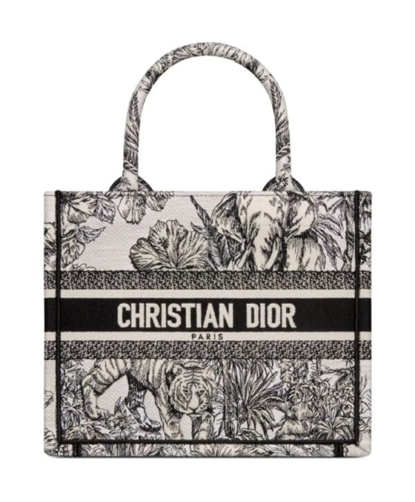 The Dior Book Tote, designed by Maria Grazia Chiuri, Creative Director of Dior, is a timeless embodiment of the Dior aesthetic. Expertly embroidered with the Voyage Jouy print pattern created by Pietro Ruffo, it beautifully merges Indian-inspired flora and fauna with Mr. Dior’s iconic motifs. Designed to hold all daily essentials, this small tote is adorned with the Dior Paris signature on the front, showcasing the House’s unparalleled savoir-faire. Perfectly sized for versatility, it can be elegantly carried by hand.