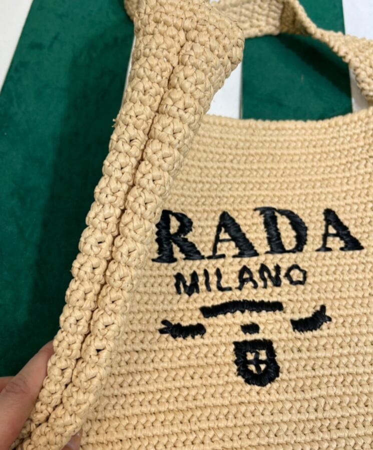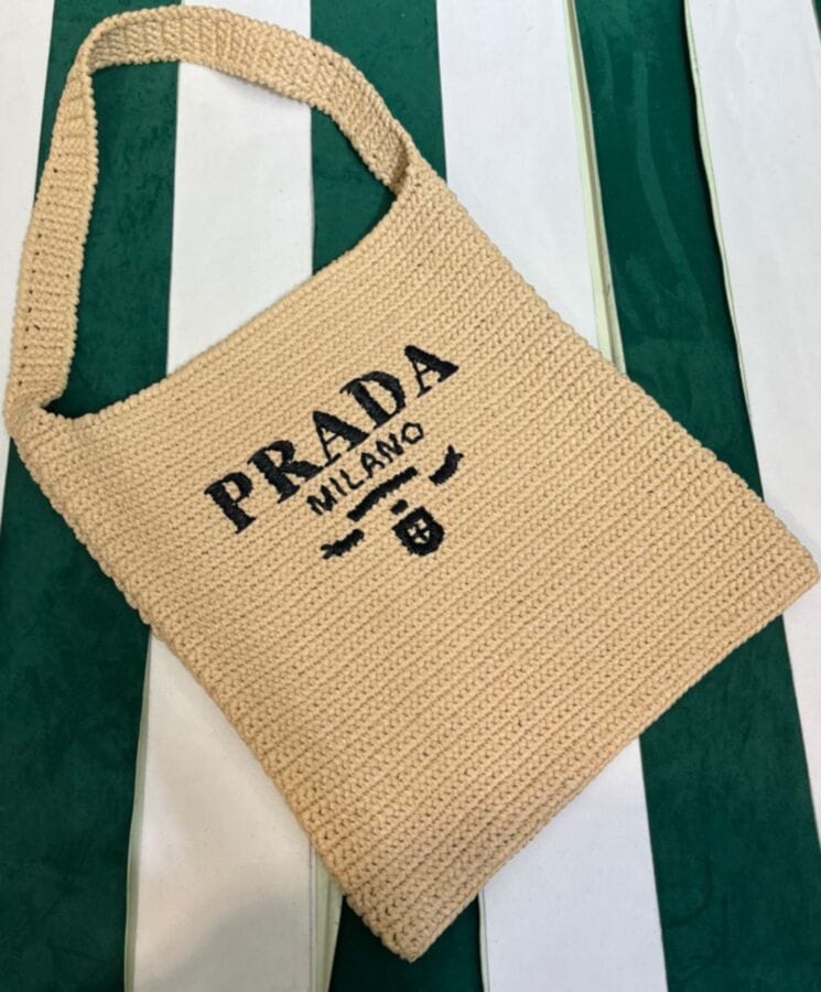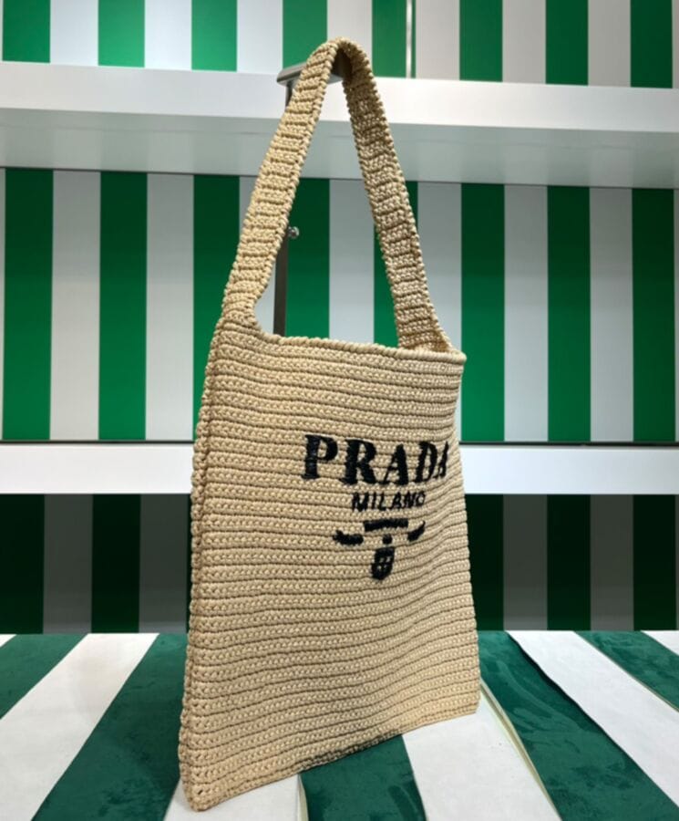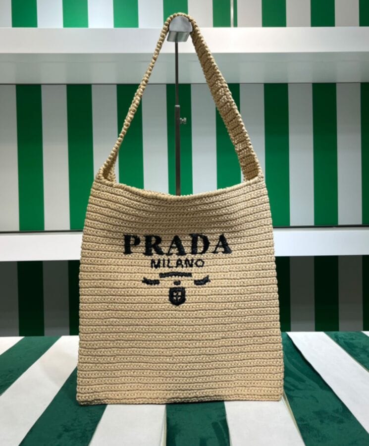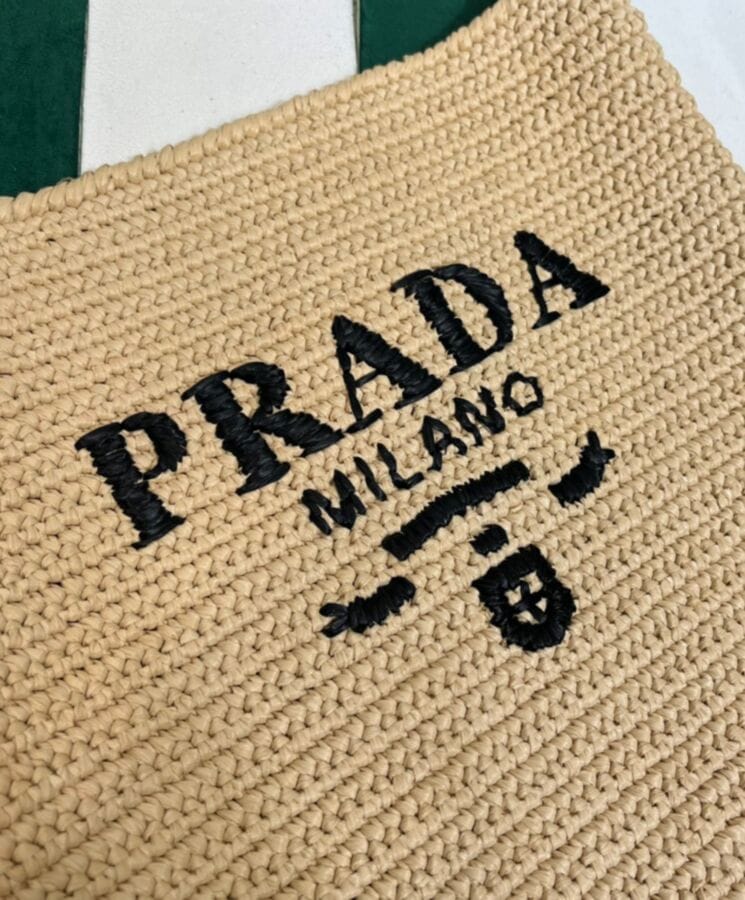 - Lining: Unlined for a breezy, effortless style.Maxi Raffia-Effect Tote BagThis maxi tote bag combines a soft, deconstructed design with raffia-effect yarn, a lightweight, natural material perfect for summer. The front is adorned with an embroidered lettering logo, while the iconic enameled metal triangle logo adds an elegant touch to the back.