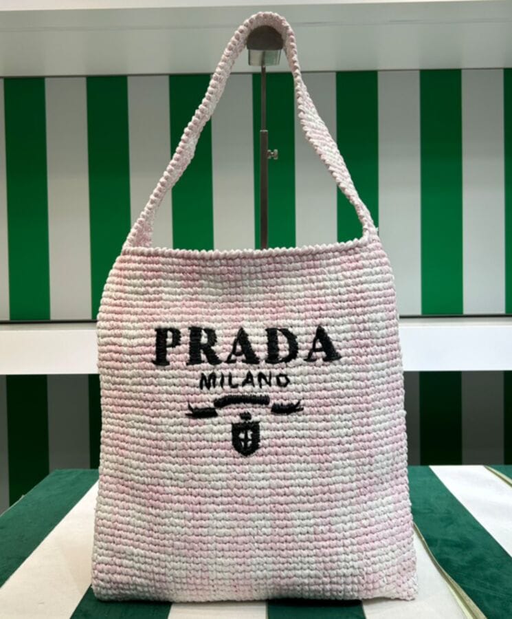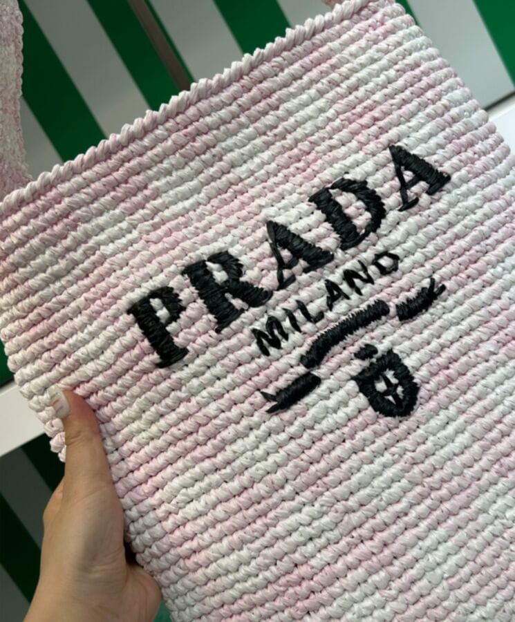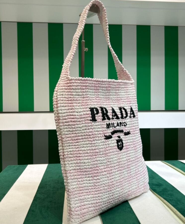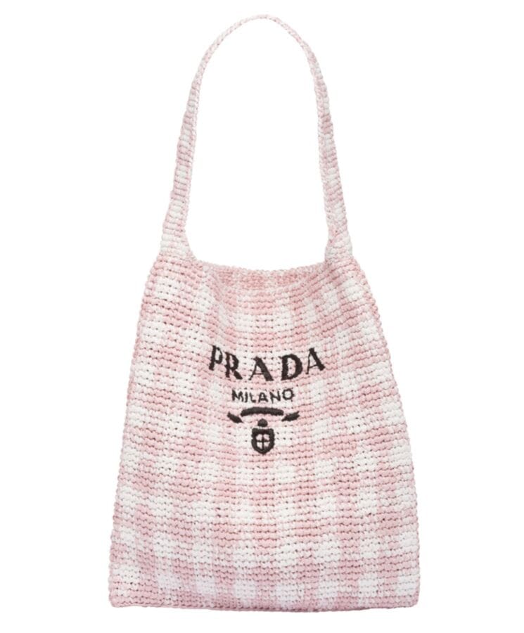 This maxi tote bag features a relaxed, deconstructed silhouette, crafted from raffia-effect yarnโa lightweight, natural material that exudes summer vibes. The front showcases an embroidered lettering logo, while the iconic enameled metal triangle logo adds a signature touch to the back.