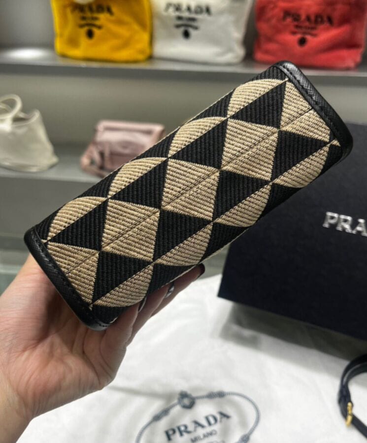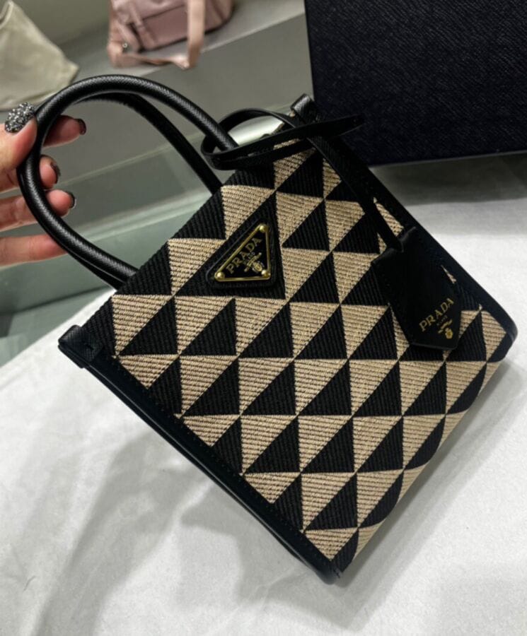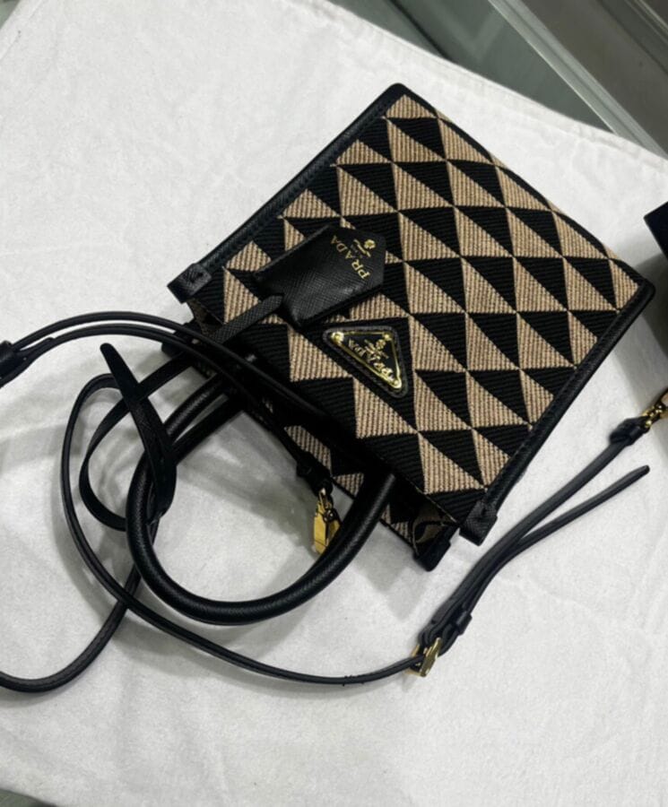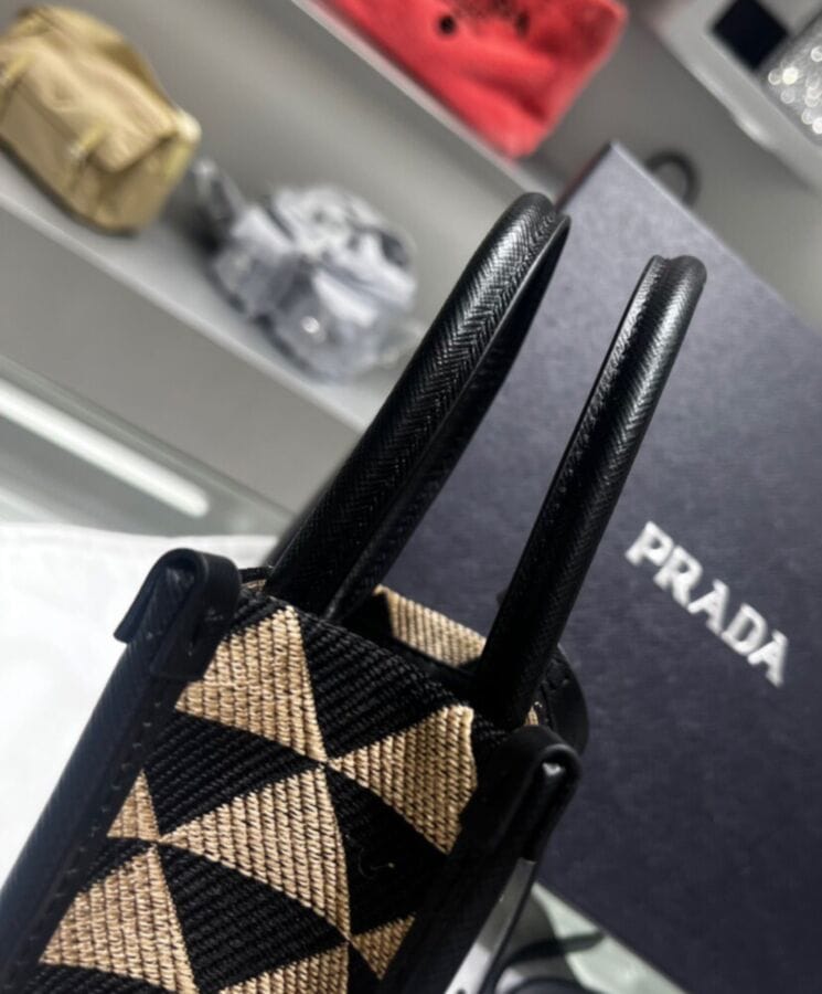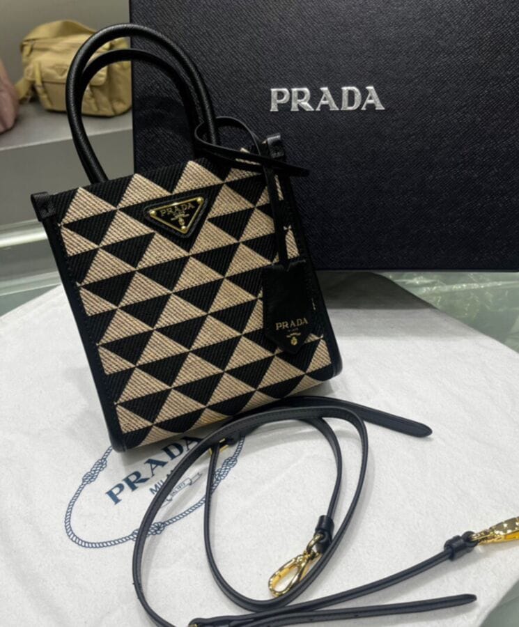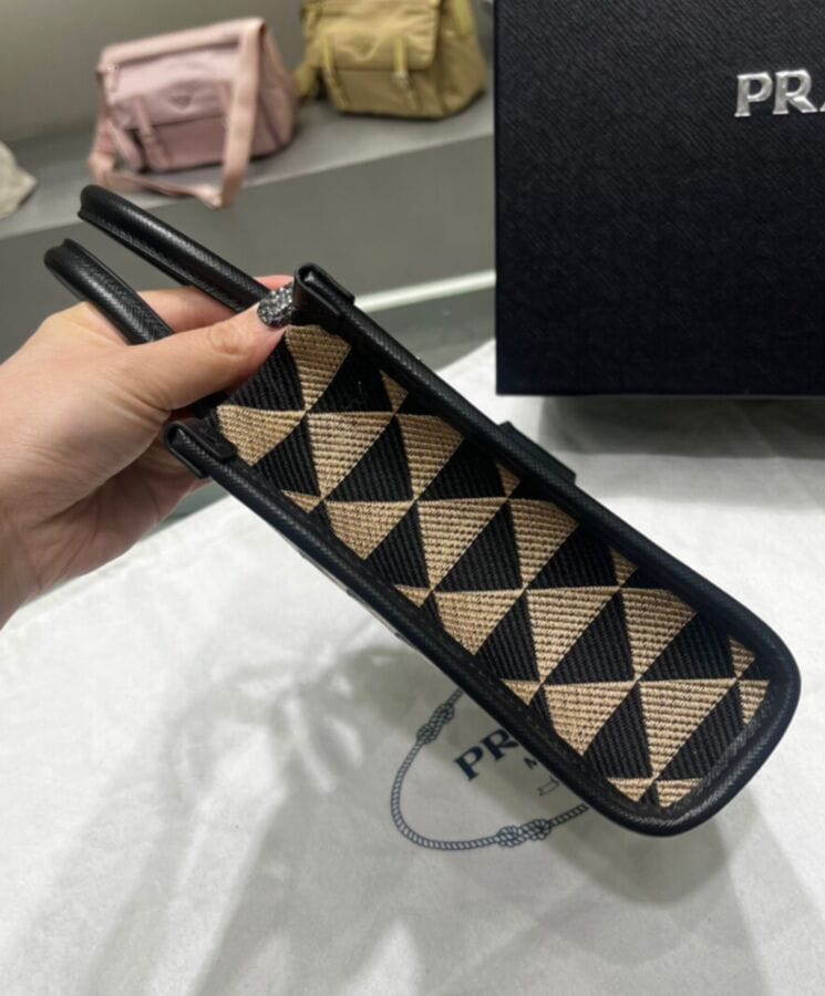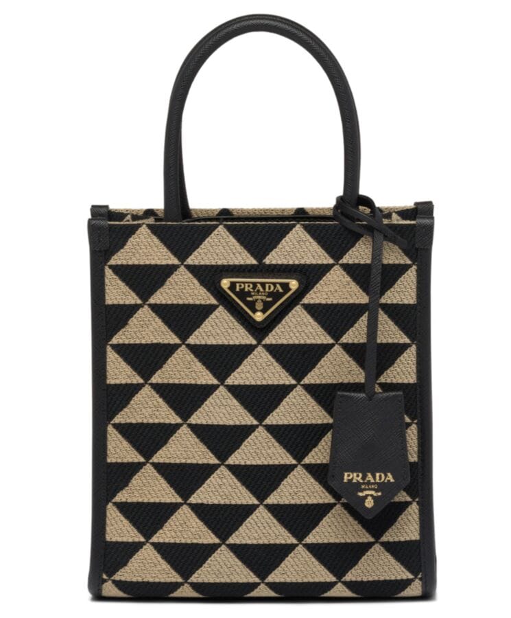 First introduced on trunks by Mario Prada, the Prada triangle symbolizes uniqueness and modernity with its minimalist, universal shape, reinvented each season. In this mini tote bag, the geometric design transforms into a sophisticated modernist pattern featuring contrasting colors, enhancing the sleek silhouette. Signature Saffiano leather details complete the design, and the detachable shoulder strap offers versatile styling options.