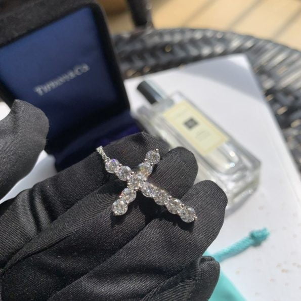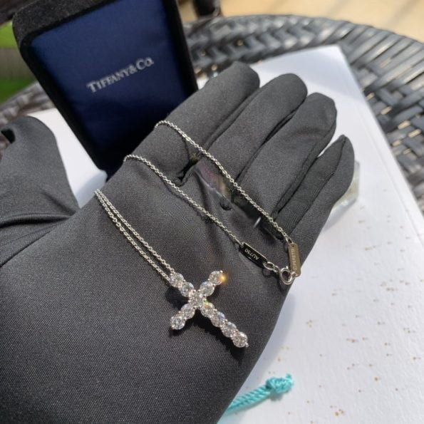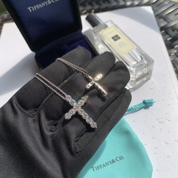 This fake Tiffany cross necklace is high quality, elegant and stylish. The sterling silver cross is set with sparkling round cut diamonds for a simple and classic design that will suit any style. This beautifully crafted replica Tiffany Cross diamond necklace will last a lifetime.
