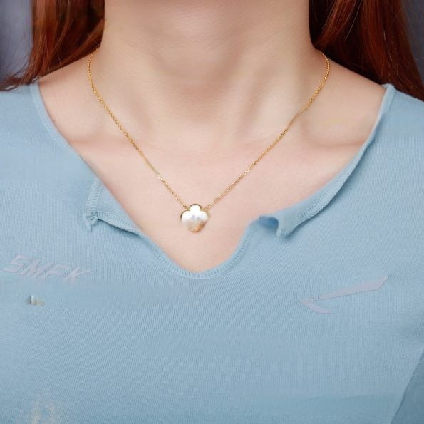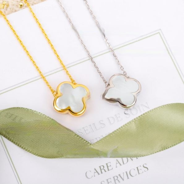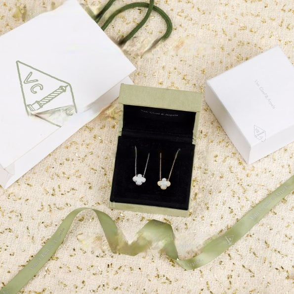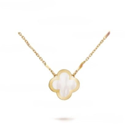 The single-motif Magic Alhambra long necklace reveals another way of playing with the size and materials of the iconic motif. A transformable piece, this jewel may be worn in several ways, including long on a single chain or short with a doubled chain.