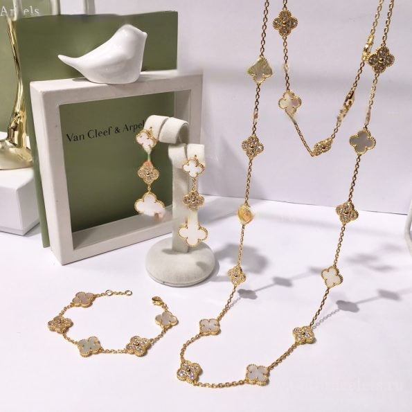 Created in 2006 by Van Cleef & Arpels, the Magic Alhambra jewelry creations gather different-sized Alhambra motifs, coming together in a joyful dance. Inspired by the clover leaf, their asymmetric designs feature different associations of materials.
